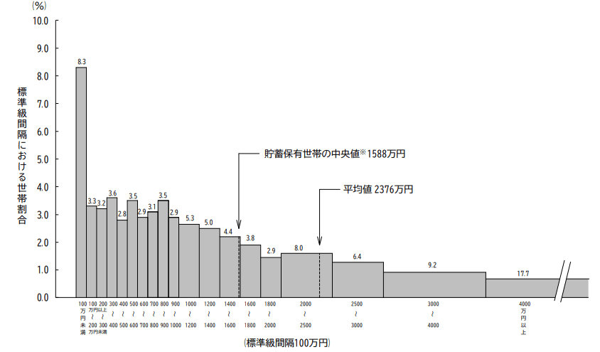 なお、貯蓄保有世帯の中央値は1588万円、平均値は2376万円です。