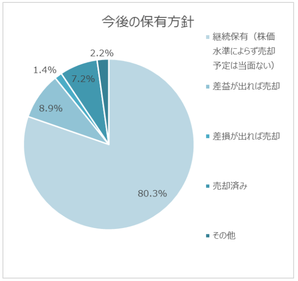 実際、吉野家ホールディングス(9861)が2022年3月4日に発表した個人株主のアンケート調査によると、株式の保有方針について「継続保有(株価水準によらず売却予定は当面ない)」が80.3%と極めて高い結果となりました。