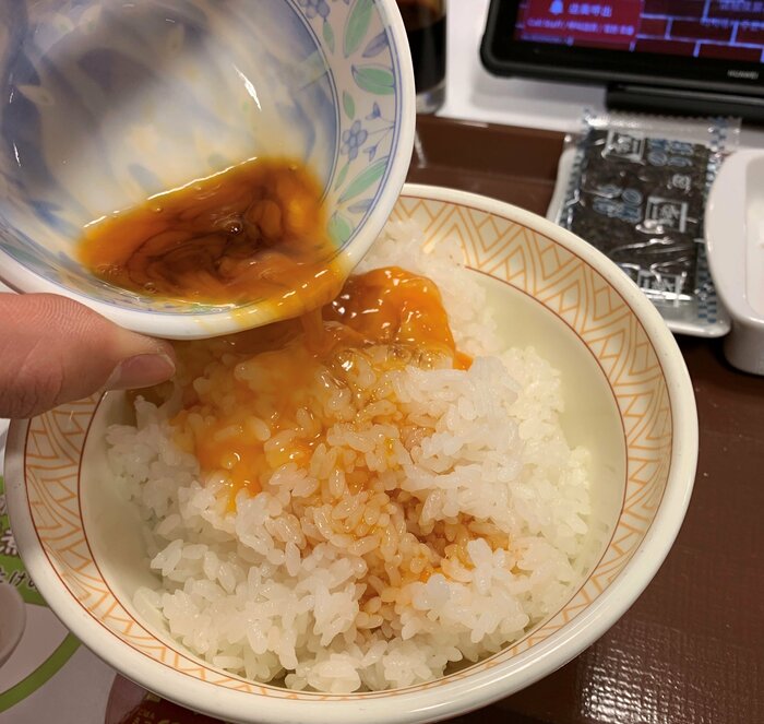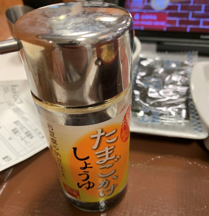 すき家の朝食セットには、卵かけご飯専用の醤油(たまごかけしょうゆ)がついてきます。