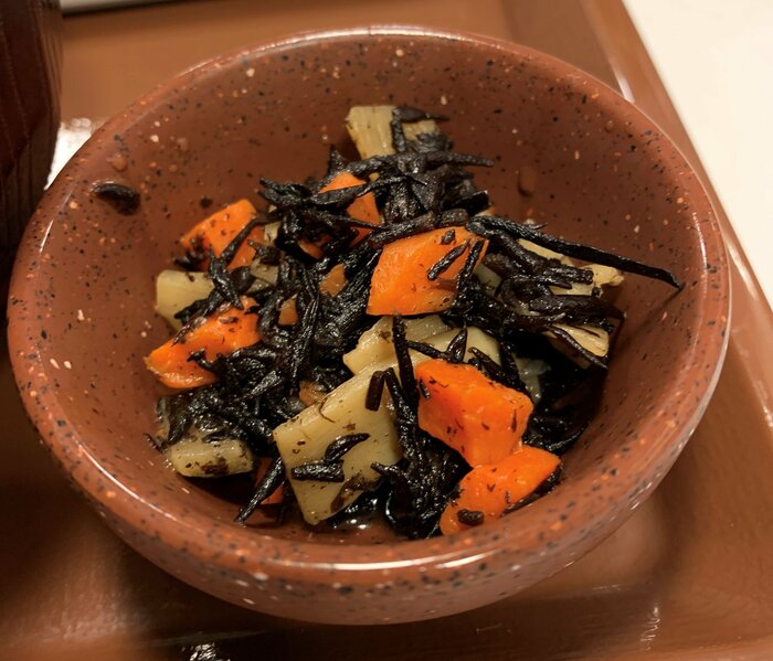 小鉢のひじきを一口食べてみると、すこし甘めの味付け。これまたご飯が進みます。