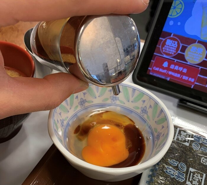 まずは玉子に醤油をかけてご飯にいれて、卵かけご飯として食べます。