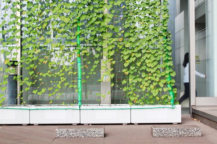 グリーンカーテンは日差しをさえぎることが目的。日当たりのよい窓際に設置するのが基本で、温風が吹き出すエアコン室外機の前はできるだけ避けます。
