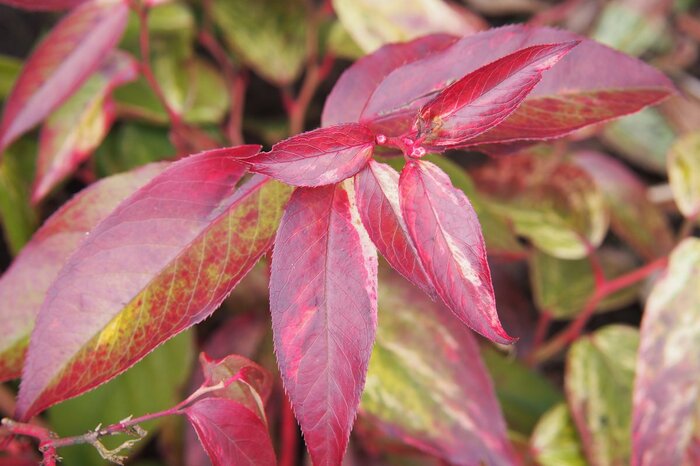 生育旺盛で育てやすく、枝が弓状に伸びていく常緑低木のイワナンテン。園芸品種「レインボー」は、芽出しは濃紅色で、葉にはピンクとクリーム色の斑が入る可愛らしい葉の品種です。庭を明るく演出できますよ。