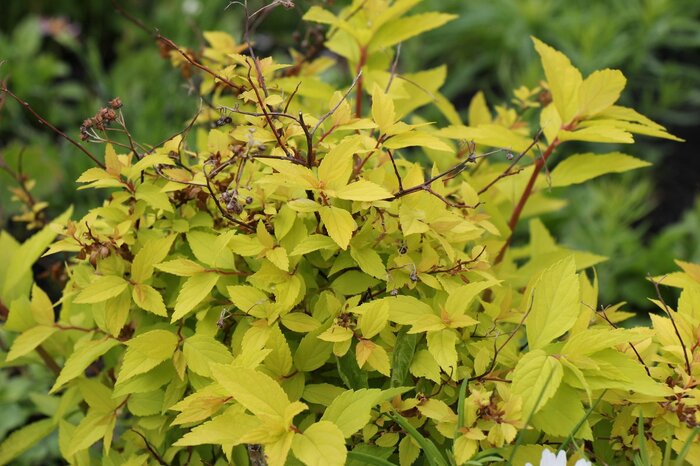 多くの品種があるシモツケは初心者にもオススメの落葉低木です。園芸品種「ゴールドフレーム」は、春に褐色の新芽が芽吹き、暖かくなるころにはライムグリーンの葉に。秋には紅葉も楽します。樹形はこんもりとボリュームのある形。