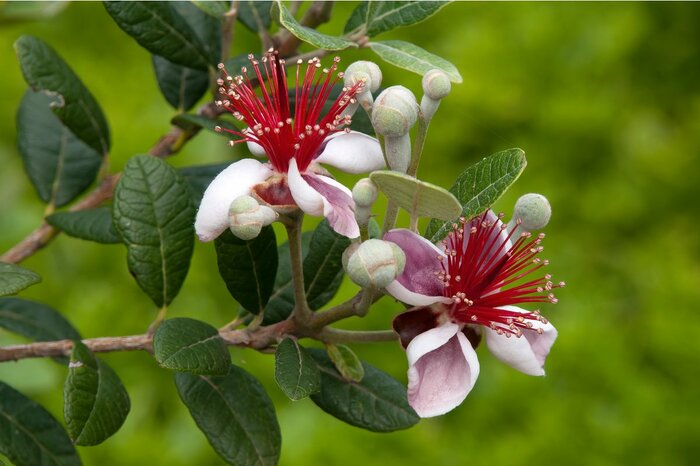 葉の表面は緑色で光沢があり、裏面は細かな綿毛に覆われた銀白色が美しいフェイジョア。フトモモ科の常緑果樹です。