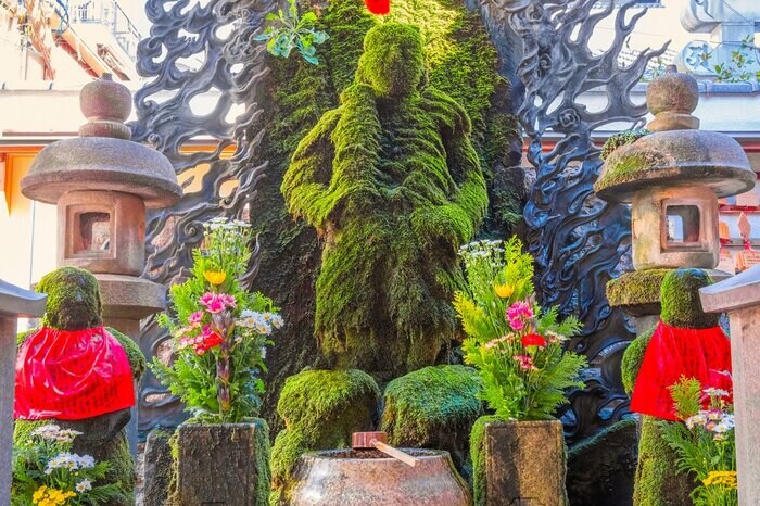 法善寺の「水掛不動尊」は、深い緑の苔に包まれた珍しい姿が拝めます。