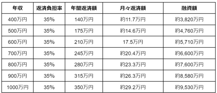 それぞれの年収における「返済負担率35%」の返済額や融資額は次の通りです。(金利1.5%・35年間借り入れ)