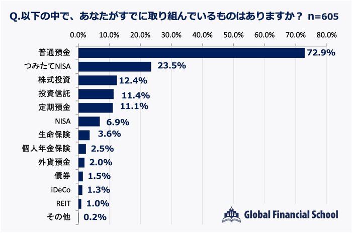 資産形成している金融商品で、最も回答が多かったのは「普通預金」が72.9%。