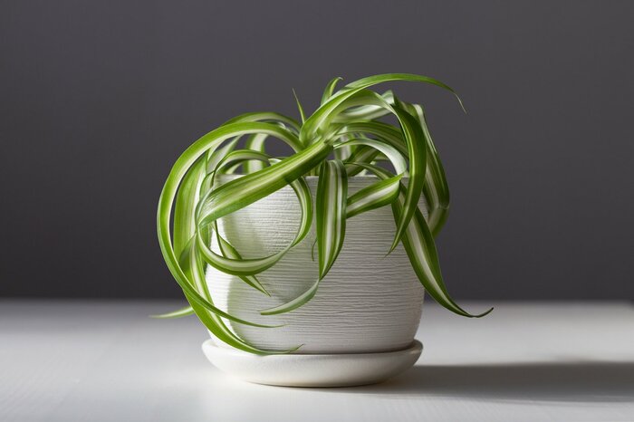 オリヅルランは細長い葉が垂れ下がるように伸びる、涼しげな見た目が特徴の観葉植物。茎の先につける子株が折り鶴に似ていることが名前の由来です。