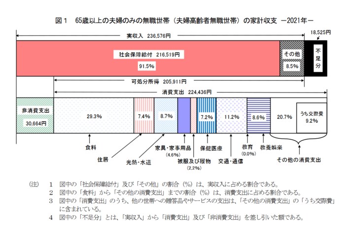 実際に定年後の1カ月の収支はどれくらいでしょうか。総務省統計局「家計調査報告 家計収支編 2021年(令和3年)平均結果の概要」より、65歳以上の夫婦のみ無職世帯の家計を確認します。