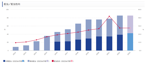 オリックスは2022年3月期の中間配当は39円、期末配当は46.6円を出しています。