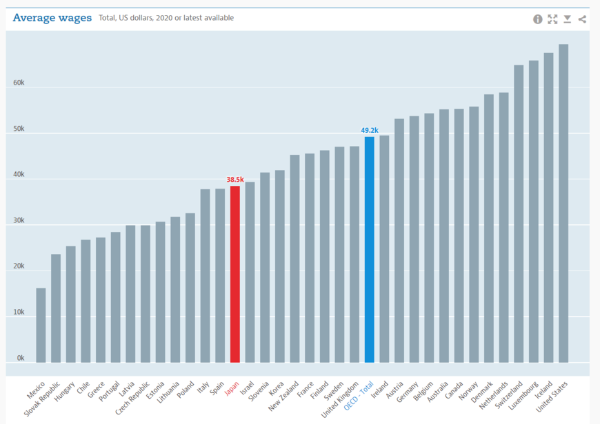 経済協力開発機構(OECD)が公表する世界の平均賃金データを見ると、日本の平均年収は35カ国中22位となっています。