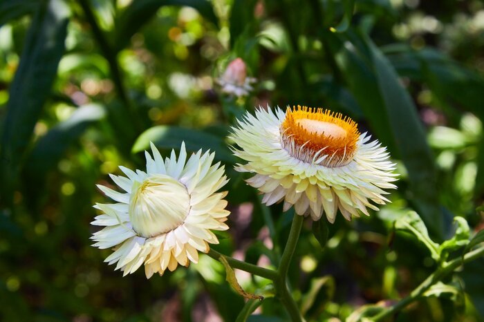 初夏から秋にかけ、麦わら帽子のような愛らしい花を咲かせるムギワラギク(帝王貝細工)。別名はヘリクリサム。やや固めで乾燥した質感の花弁が特徴です。原種は多年草ですが、高温多湿や冬の寒さに弱いため一年草として扱われます。※参考価格:200円前後(種)