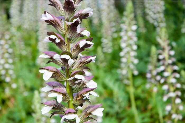 白い花びらと薄紫色のガクのコントラストが美しいアカンサス。初夏から秋にかけて開花する多年草で、ツヤがある大きな葉は大変見応えがあります。耐暑性、耐寒性ともに強く育てやすいので、ガーデニング初心者にもオススメです。※参考価格:600円前後(3号ポット苗)