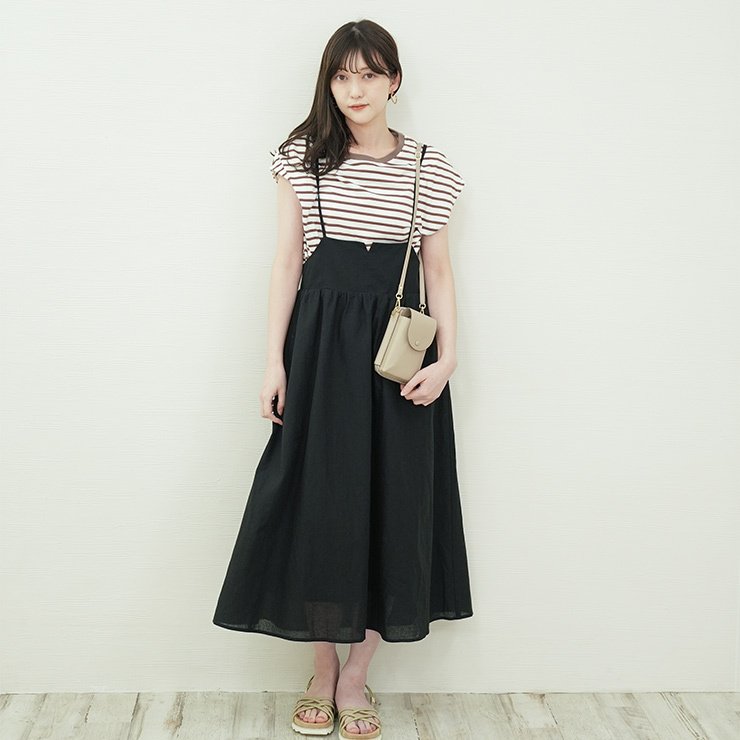 肩紐で調節可能なので、肩紐をサス風にしてマキシ丈で着ても良いですし、肩紐を短くして膝丈ワンピースにしてもかわいいでしょう。