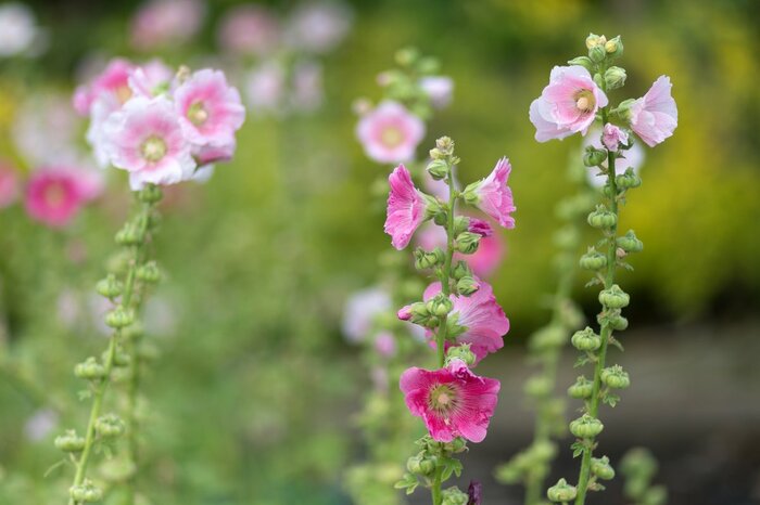 別名「梅雨葵(つゆあおい)」といい、梅雨の訪れと終わりを知らせてくれるホリホック。矮性品種は60センチほどですが、2メートルほどまで成長する品種も。耐寒性、耐暑性が強く、育てやすい多年草です。