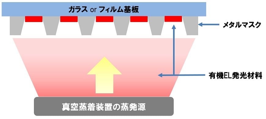 現在量産されているスマホ用有機ELディスプレーは、そのほとんどが有機EL層の成膜に真空蒸着方式を採用している。この成膜工程において、RGBそれぞれの発光材料を色ごとに塗り分けるため、ガラス基板やフレキシブル基板に対向してメタルマスクを配置することで、マスクパターンに応じて任意の位置にRGBの発光材料が成膜される仕組みになっている。この方式を一般的にFMM(Fine Metal Mask)と呼んでいる。