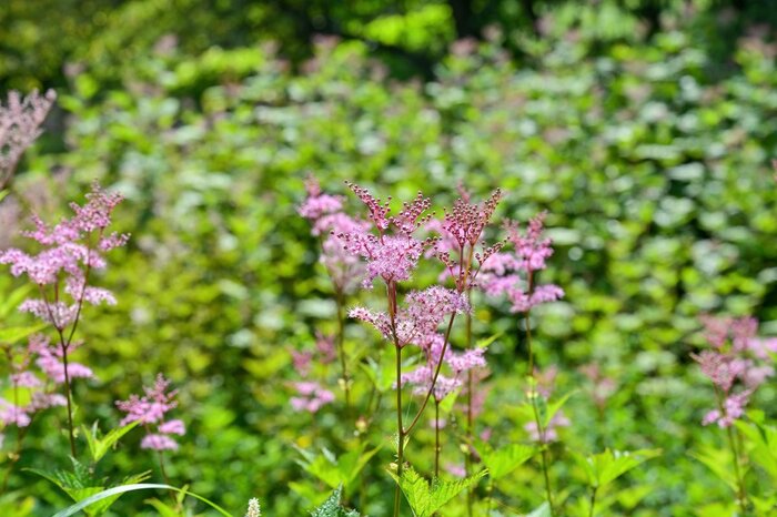 ピンクや白の小花が集まるようにして咲くシモツケソウ。葉はキレイなグリーンで、ナチュラルな魅力にあふれた多年草です。