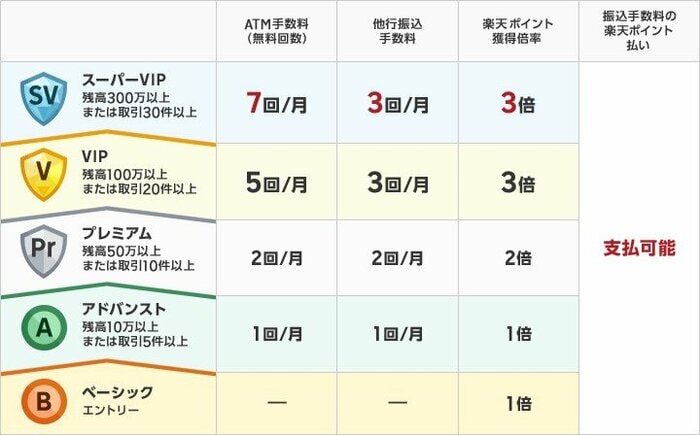 ハッピープログラムには「ベーシック」から「スーパーVIP」まで5つのステージが設けられており、最高ランクのスーパーVIPなら、楽天スーパーポイントの獲得倍率が3倍になります。給与の受け取りや振り込み、口座振替でもポイントを貯めることができ、貯まったポイントは振込手数料や外貨預金の預け入れなどにも利用できます。