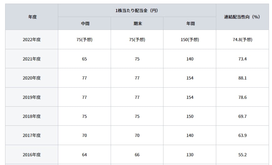 JTの2021年12月期の中間配当は65円、期末配当は75円でした。そのため、100株ベースの配当金のリターンは14,000円でした。