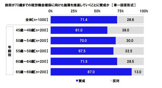 また、政府が70歳までの就労機会確保に向けた施策を推進していくことに賛成か聞いたところ、「賛成」は71.4%、「反対」は28.6%で、肯定的にとらえている人が多数派となりました。