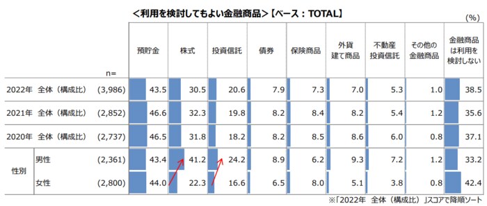 一般社団法人投資信託協会が全国の60歳以上の男女5161人に行った「60歳代以上の投資信託等に関するアンケート調査報告書-2021年(令和3年)」で利用を検討しても良いと思う金融商品を聞いたところ、「預貯金」(43.5%)「株式」(30.5%)「投資信託」(20.6%)の順でした。