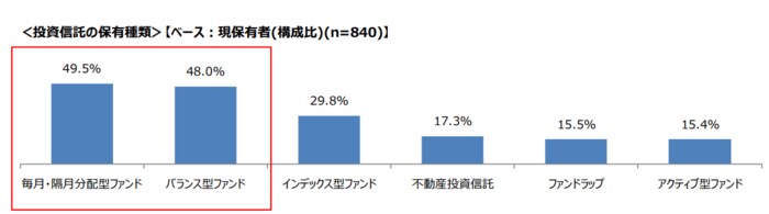 毎月・隔月分配型ファンドとバランス型ファンドが5割弱と多くを占めており、次にインデックス型ファンドでした。