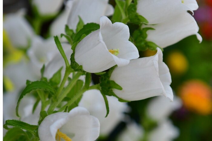 釣り鐘型の花が風に揺れて涼しげなカンパニュラ。高く伸びた茎の下から上へと穂状に咲き進みます。雨で倒れないように支柱で支えましょう。