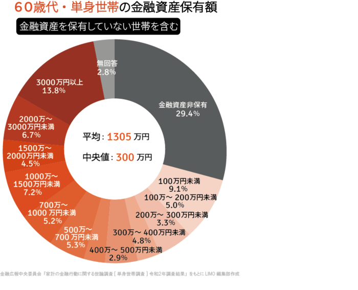 60代のおひとりさまの貯蓄額の平均は1305万円ですが、平均は一部の大きな数字に引っ張られるもの。より実態に近い中央値は300万円です。