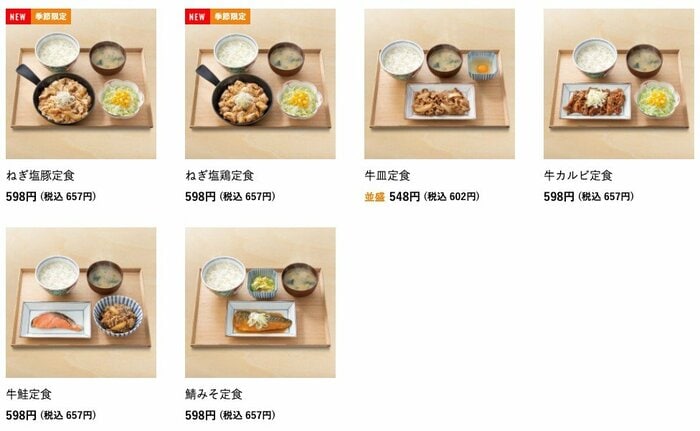 定番の牛皿定食をはじめ、牛カルビ定食、牛鮭定食などを展開しています。2022年5月現在は季節限定でねぎ塩豚定食・ねぎ塩鶏定食も販売中。