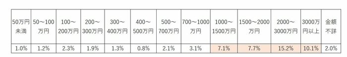 借入金がある世帯の平均借入金額は1119万7000円。借入金額を階級別に見てみると、最も割合が高かったのは「2000万円~3000万円未満」で15.2%、次いで「3000万円以上」10.1%、「1500~2000万円未満」7.7%、「1000~1500万円未満」7.1%と続きました。