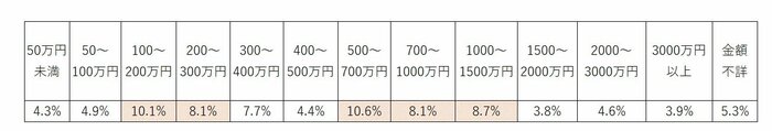 貯蓄額を階級別にみると、最も割合が高かったのは「500~700万円未満」で10.6%、次いで「100~200万円未満」が10.1%、「1000~1500万円未満」が8.7%、「200~300万円未満」「700~1000万円未満」が同率で8.1%でした。