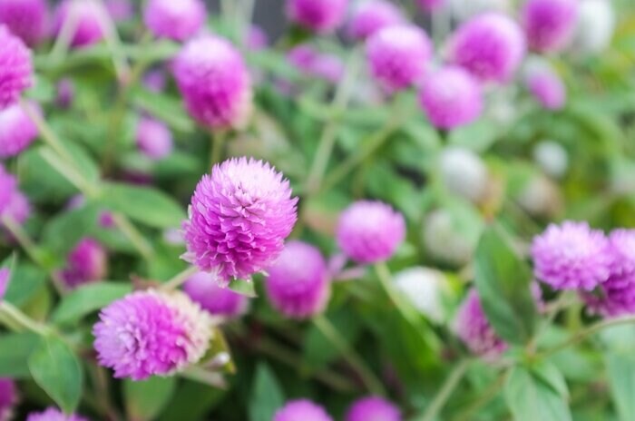 丸い花形が可愛らしいセンニチコウ。白やピンクが定番ですが、イチゴのような赤い花を咲かせる園芸品種「ストロベリー・フィールズ」もオシャレです。草丈が高いので、寄せ植えの後方に植えるとよいでしょう。