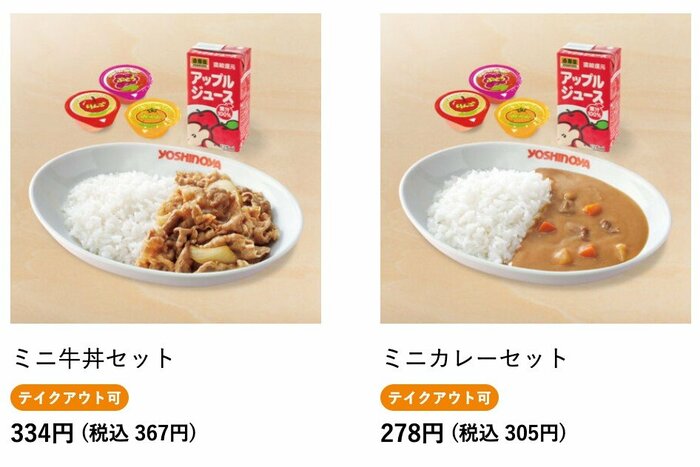 吉野家のお子様メニューは定番のおいしさが味わえる「ミニ牛丼セット」と野菜たっぷりの「ミニカレーセット」の2種類を展開中。