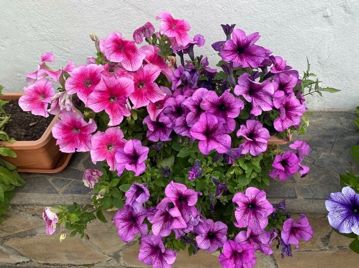 ひとつの鉢を小さな花壇に見立て、数種類の花を植えて作る寄せ植え。