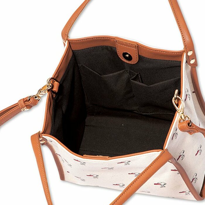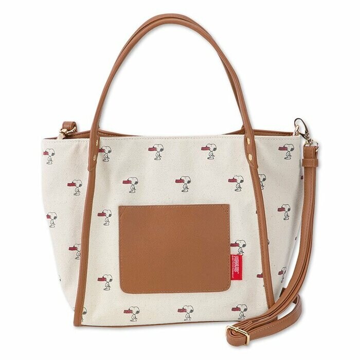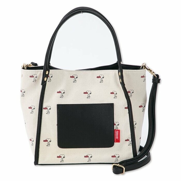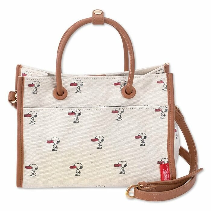大人気キャラクタースヌーピーを総柄にしたバッグです。ペットボトルが入るくらいの大きさで、ハンドバッグとしてもショルダーバッグとしても使えるサイズです。内ポケット3つに加え、外側にもポケットがあるので、定期入れやリップなどの小物が収納できる便利なアイテムです。