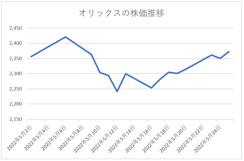 今回のオリックスについても、リリースが織り込まれた2022年5月12日の株価の終値は、前日比2.3%安の2,241.5円となりました。