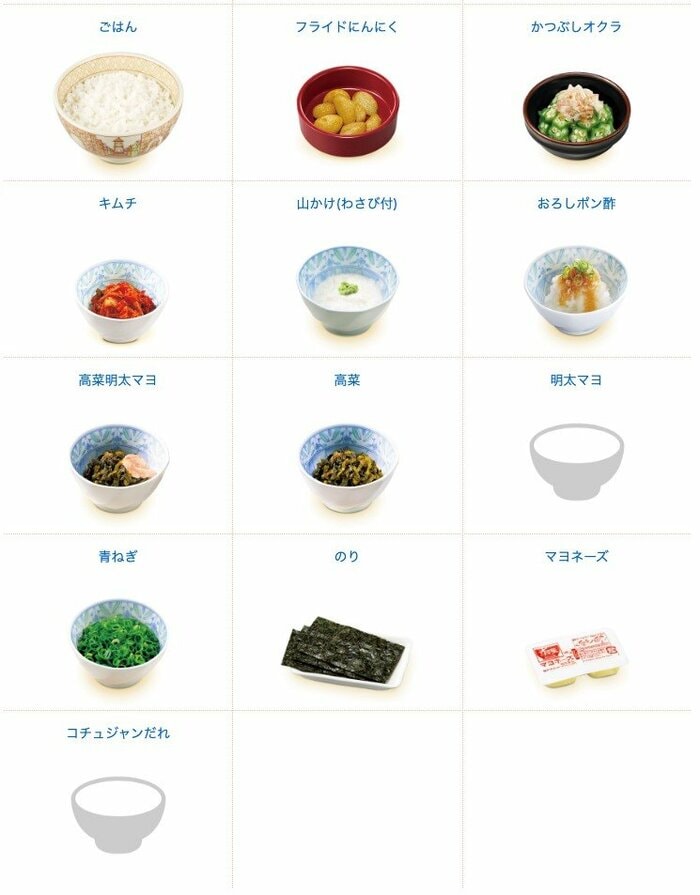 牛丼にプラスしたくなる、卵やキムチ、納豆はもちろん、変わり種のフライドニンニクなど選ぶのが楽しくなるものばかりです。