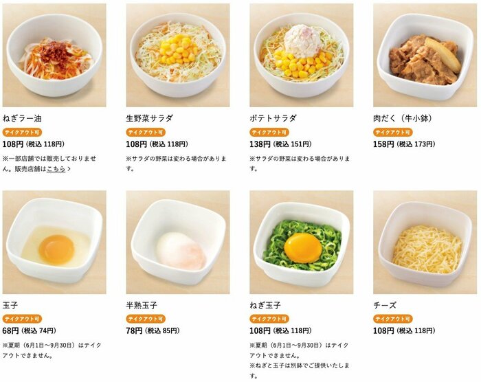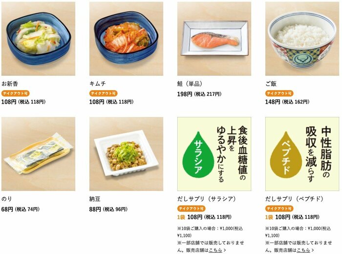 もちろん、牛丼にちょっとプラスしたい玉子や半熟玉子、キムチなどの定番メニューも充実しています。店舗限定販売の「だしサプリ」も気になりますね!
