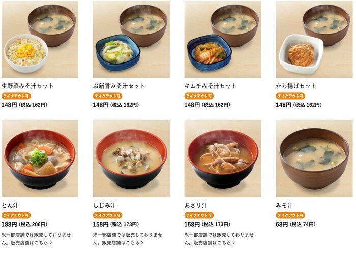 吉野家のサイドメニューは生野菜みそ汁セット、お新香みそ汁セット、キムチみそ汁セット、から揚げセットなどの味噌汁とのセットが豊富です。