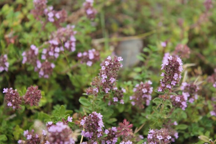 シソ科のハーブで、たくさんの品種があるタイム。立性のコモンタイム、匍匐性のクリーピングタイム、香りのよいレモンタイムなどがあります。春から初夏にかけて花が咲きますが、品種によって異なります。