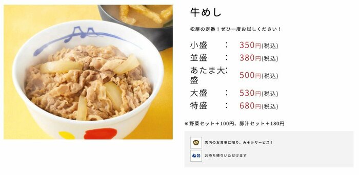 続いては松屋の牛めし。すき家・吉野家が「牛丼」となっているのに対して、松屋だけは「牛めし」のネーミング。小盛〜特盛まで5種類のサイズから選ぶことができます。