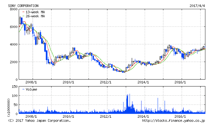 ソニーの株価は2016年2月に底打ちし、その後2017年に入っても好調が続いています。2017年1月に3,305円だった株価は3月末時点で3,766円。急激な動きとは言えませんが、徐々に下値を切り上げつつ上昇中です。