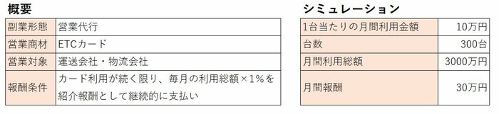 ETCコーポレートカードに興味のある運送会社や物流会社を紹介するというケースで、代行者(紹介者)にはカードの利用が続く限り、毎月のETCカード利用総額×1%が紹介報酬として継続的に支払われるというものです。