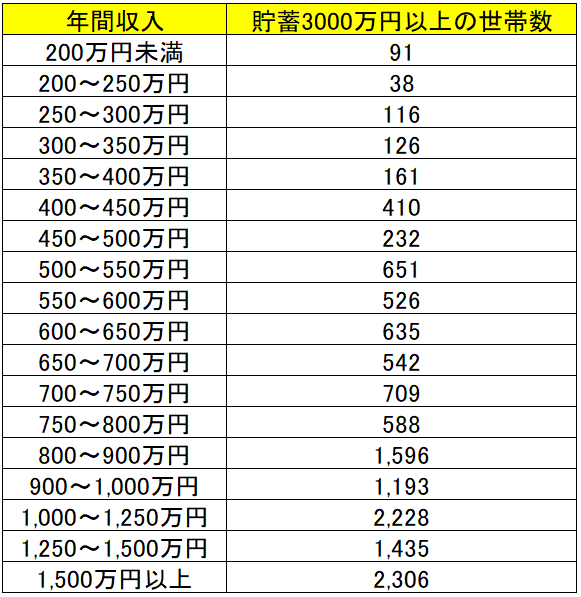 では、貯蓄3000万円以上を達成している世帯の年間収入は、どのような状況でしょうか。