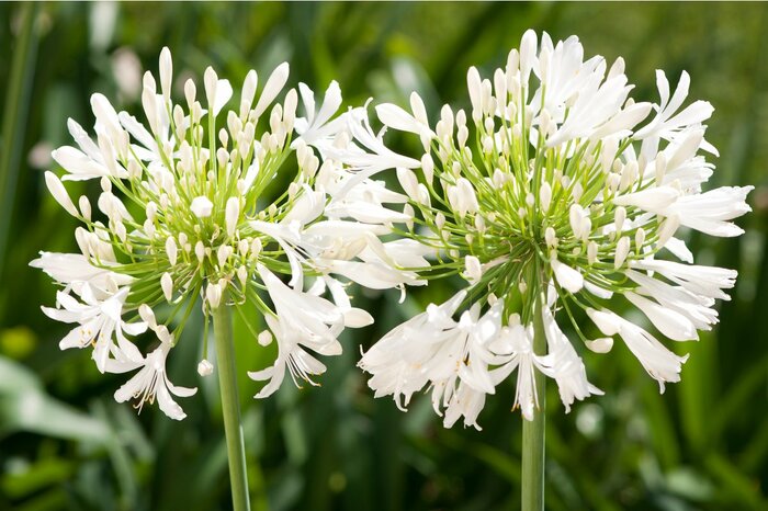 花火のような球形の花が咲くアガパンサス。30センチ程度のわい性の品種もありますが、おおむね草丈が高く、華やかな印象です。白や紫の花色は涼やかで、切り花にもオススメ。