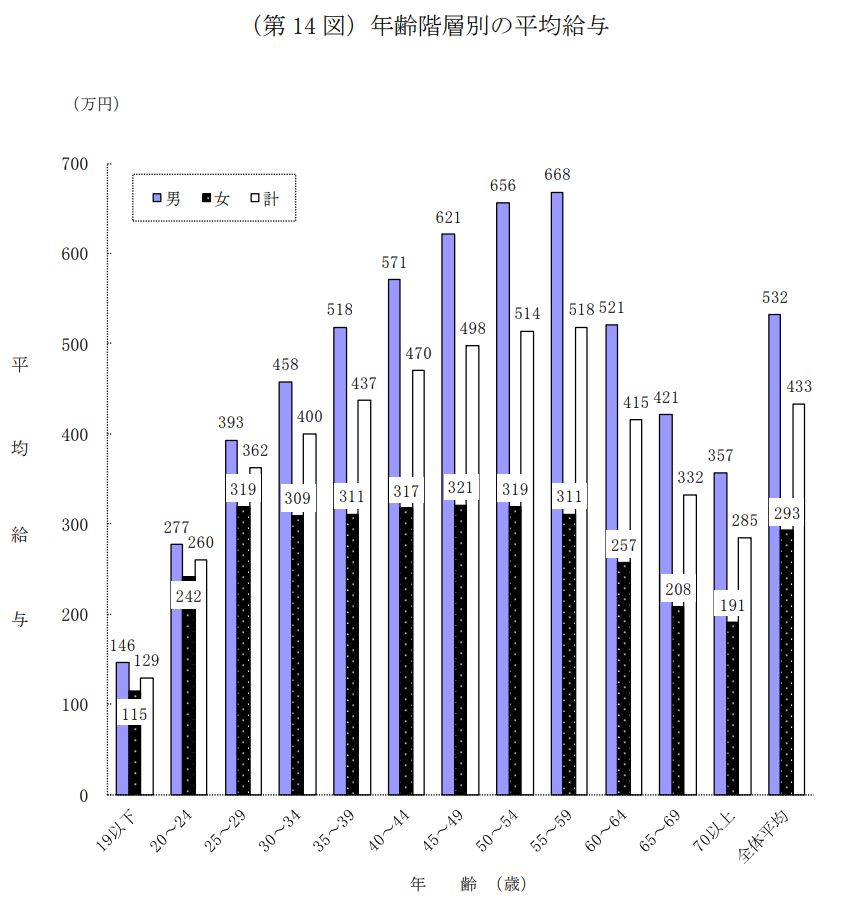 男性の年齢別平均給与を見ると、年収600万超の世代は45歳~59歳までとなっています。