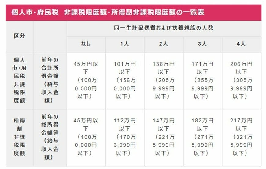 東京23区の場合、前年の合計所得金額が45万円以下であれば、扶養家族の有無にかかわらず非課税となることがわかりました。