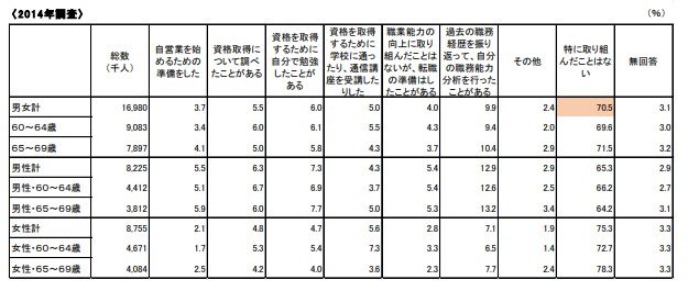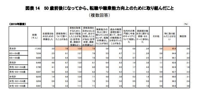 全ての調査対象者に、高齢期のキャリアを意識して行った職業能力開発や転職準備等について複数回答で尋ねたところ、「特に取り組んだことはない」が 65.4%と最も多くなりました。