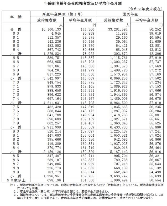 次に、70代の年金額を知るべく、厚生労働省「令和2年度 厚生年金保険・国民年金事業の概況」をより、国民年金と厚生年金に分けて1歳ごとの平均受給額を見ていきましょう。